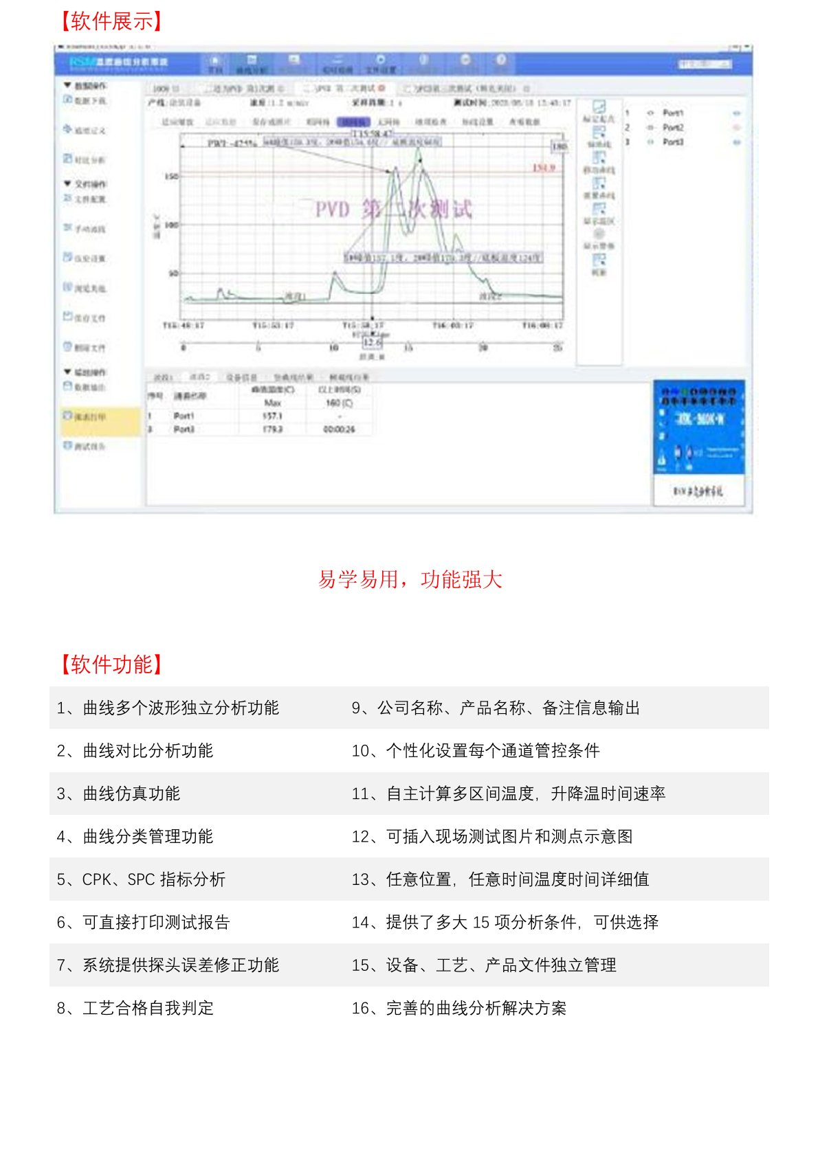 我们的监测系统经过特殊设计,随产品一起通过真空镀膜设备,不会中断生产线,多达10根热电偶与产品连接来记录温度,以取得一个真实的产品过炉温度曲线。 在测量完成后,功能强大的软件包分析所记录的数据,以确保温度是否满足生产规范。为您优化温度及调整带速等提供科学的数据基础,能迅速提高生产效率,保证产品品质。并解决缺乏实时数据记录,问题追溯难,处理成本高的难题。